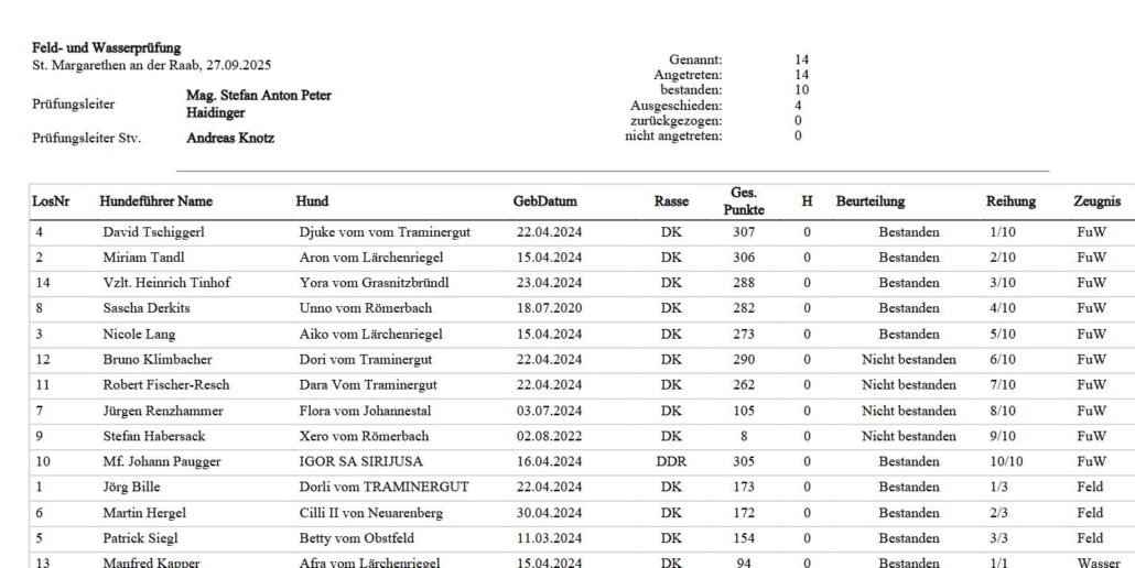 Von den 14 genannten Gespannen konnten 6 Hunde die Feld und Wasserprüfung bestehen.