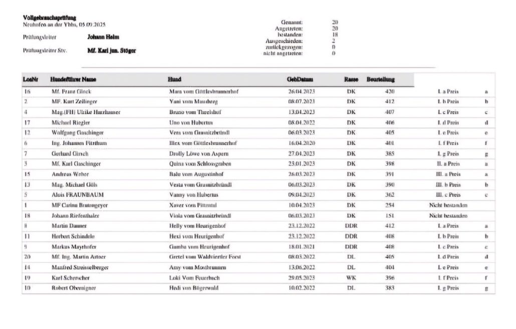 Bei bereits herbstlichem Wetter, fand die Vollgebrauchsprüfung des ÖKK in Neuhofen/Ybbs statt. Am ersten Prüfungstag durfte ich 20 Gespanne im Gasthaus Gürtler begrüßen, von denen 18 Hundeführern mit ihren Hunden die VGP erfolgreich bestanden haben.Wir konnten eindrucksvoll erleben, wie gut ausgebildete Hunde in allen Bereichen, von der Waldarbeit, der Feldarbeit bis zur Wasserarbeit ihr Können in den gut strukturierten Niederwildrevieren rund um Neuhofen/Ybbs unter Beweis stellen konnten.